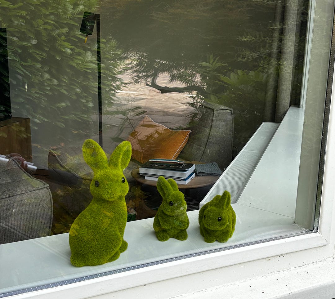 We are trying not to have a completely Ikea furnished and accessorized house so how to get the rest when you don’t have a car and don’t really know where to shop?? We grab small items every time we’re in the city center to carry home in our bike crates but mostly it’s E-Commerce. There are also thrift shops (Kringloopwinkel - what a name!). They are huge here! We tried several visits but didn’t find what we needed. Except some awesome green fuzzy bunnies which I scored for 4 Euros. When I get too lazy to keep the front window display flowers up to date (this is a thing), these will suffice.